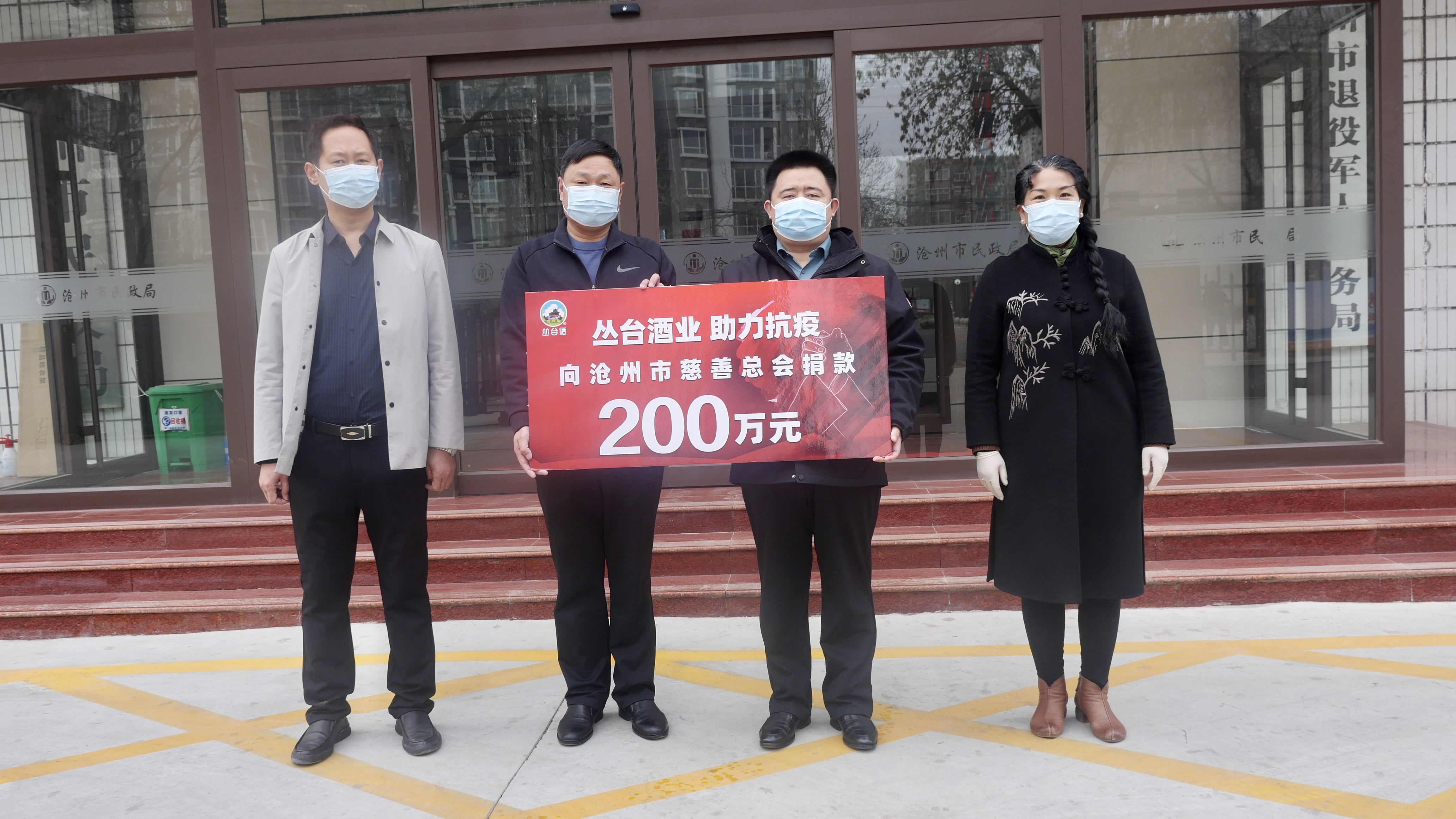 3月23日,叢臺(tái)酒業(yè)向滄州慈善總會(huì)捐款200萬(wàn)元。4月2日,叢臺(tái)酒業(yè)再次向滄州捐款100萬(wàn)元,奉獻(xiàn)叢臺(tái)愛(ài)心。此次疫情中,已累計(jì)向滄州捐款300萬(wàn)元,與滄州人民一起共克時(shí)艱。