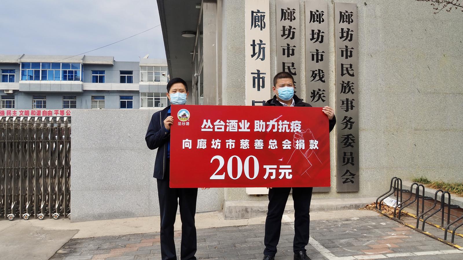 3月30日,叢臺(tái)酒業(yè)向廊坊慈善總會(huì)捐款200萬(wàn)元,全力支援廊坊疫情防控。廊坊市民政局四級(jí)調(diào)研員劉巖、廊坊市慈善總會(huì)會(huì)長(zhǎng)楊再松為叢臺(tái)酒業(yè)關(guān)心支持廊坊市疫情防控工作的大愛(ài)善舉表示感謝。
