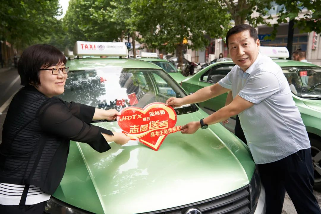 “志愿送考”啟動儀式現(xiàn)場,與會領(lǐng)導(dǎo)為車輛張貼“志愿送考”標(biāo)識,同時為志愿者頒發(fā)活動紀(jì)念證書。為考生助力,為夢想加油!一輛輛出租車整齊集結(jié),蓄勢待發(fā),成為一道靚麗的風(fēng)景線。