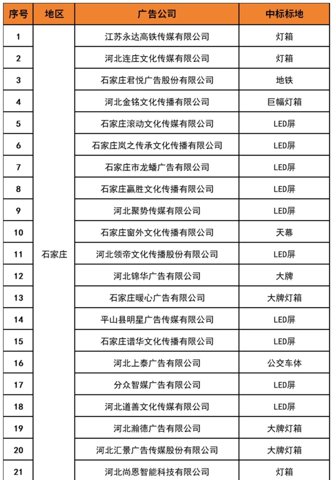 邯鄲市叢臺(tái)酒業(yè)營(yíng)銷有限公司2024年度河北省地標(biāo)廣告招標(biāo)項(xiàng)目(項(xiàng)目編號(hào):叢臺(tái)酒業(yè)【2024】招003號(hào)),于2023年11月21日發(fā)布招標(biāo)公告,2023年12月9日-2023年12月19日進(jìn)行開(kāi)標(biāo)評(píng)估、洽談工作。經(jīng)評(píng)標(biāo)委員會(huì)評(píng)審,現(xiàn)將評(píng)審后中標(biāo)公司予以公示。