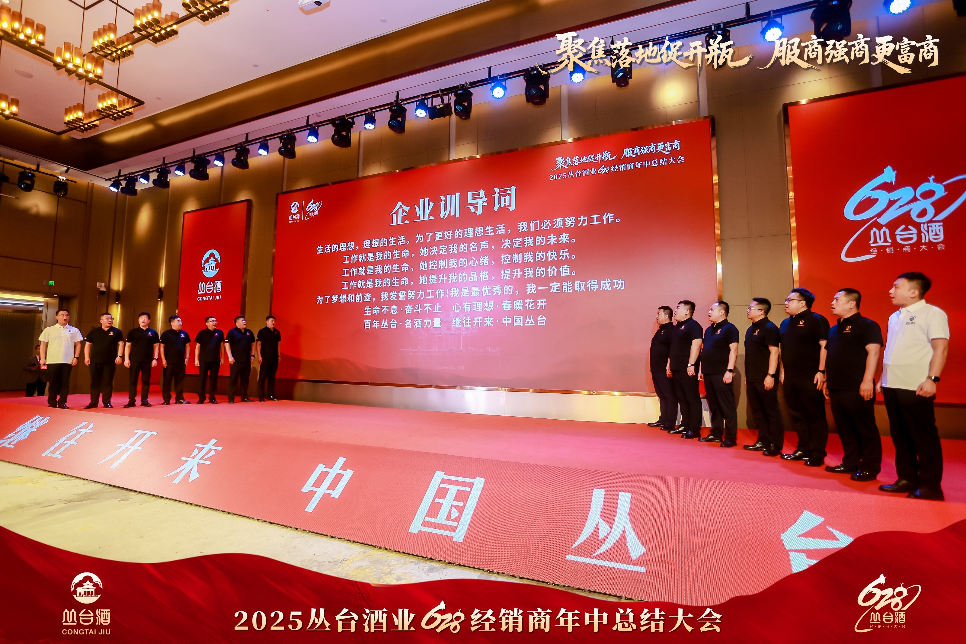 在企業(yè)訓導(dǎo)詞環(huán)節(jié),叢臺酒業(yè)營銷有限公司二公司營銷總監(jiān)季磊帶領(lǐng)團隊領(lǐng)誦企業(yè)訓導(dǎo)詞,“快速決策,馬上落實”“強商富商,共同發(fā)展”的理念響徹會場。隨后,全體領(lǐng)導(dǎo)、嘉賓及經(jīng)銷商在酒店大堂拍攝紀念合影,定格這一重要時刻。
